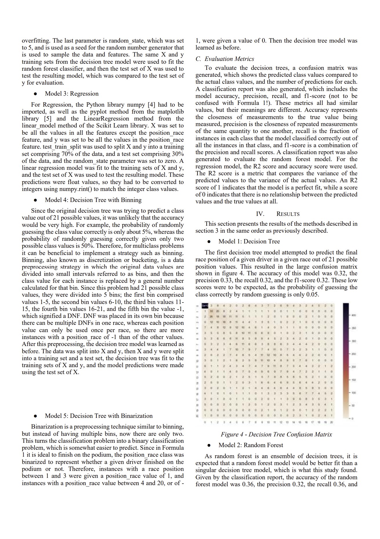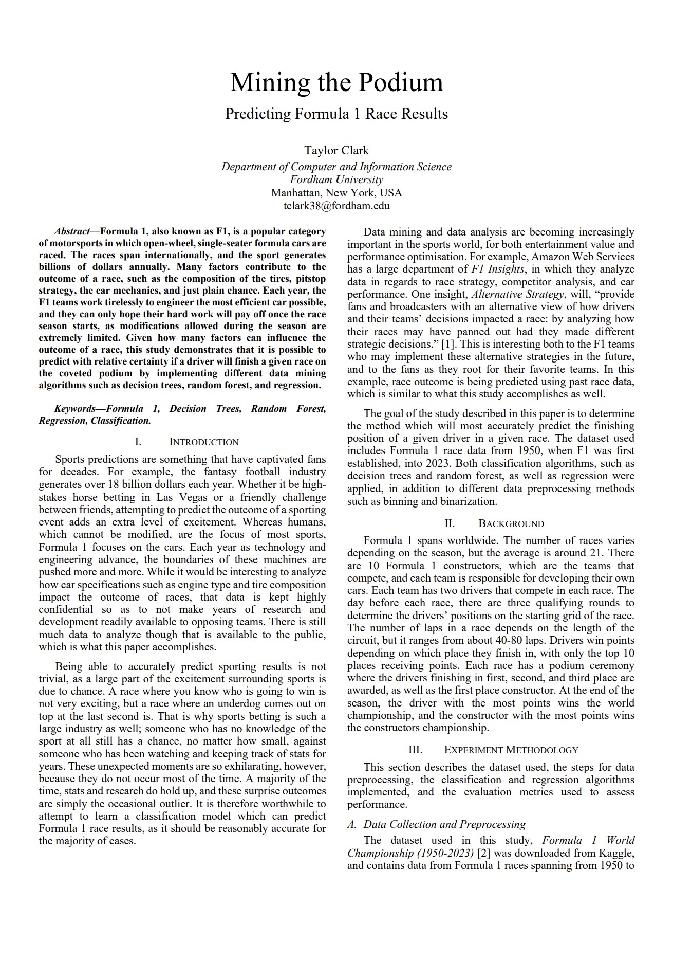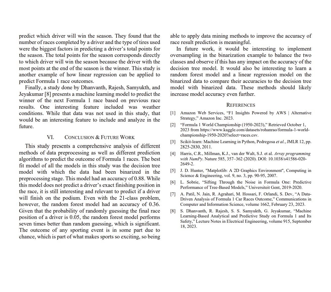 For my Fall 2023 Data Mining class, our final project was to design and develop a research project implementing different data mining strategies we learned about throughout the semester and present our results in an IEEE standard research paper. My friends and I really enjoy watching Formula 1 together, so I decided to base my project on predicting Formula 1 race results. In this project I explored different data preprocessing techniques such as discretization and binarization. For the model I implemented the classification methods of decision trees and random forest, as well as regression. I created this project using Python Scikit Learn. I learned so much about data mining and Python while working on this project, and now I can't wait for the next one!!